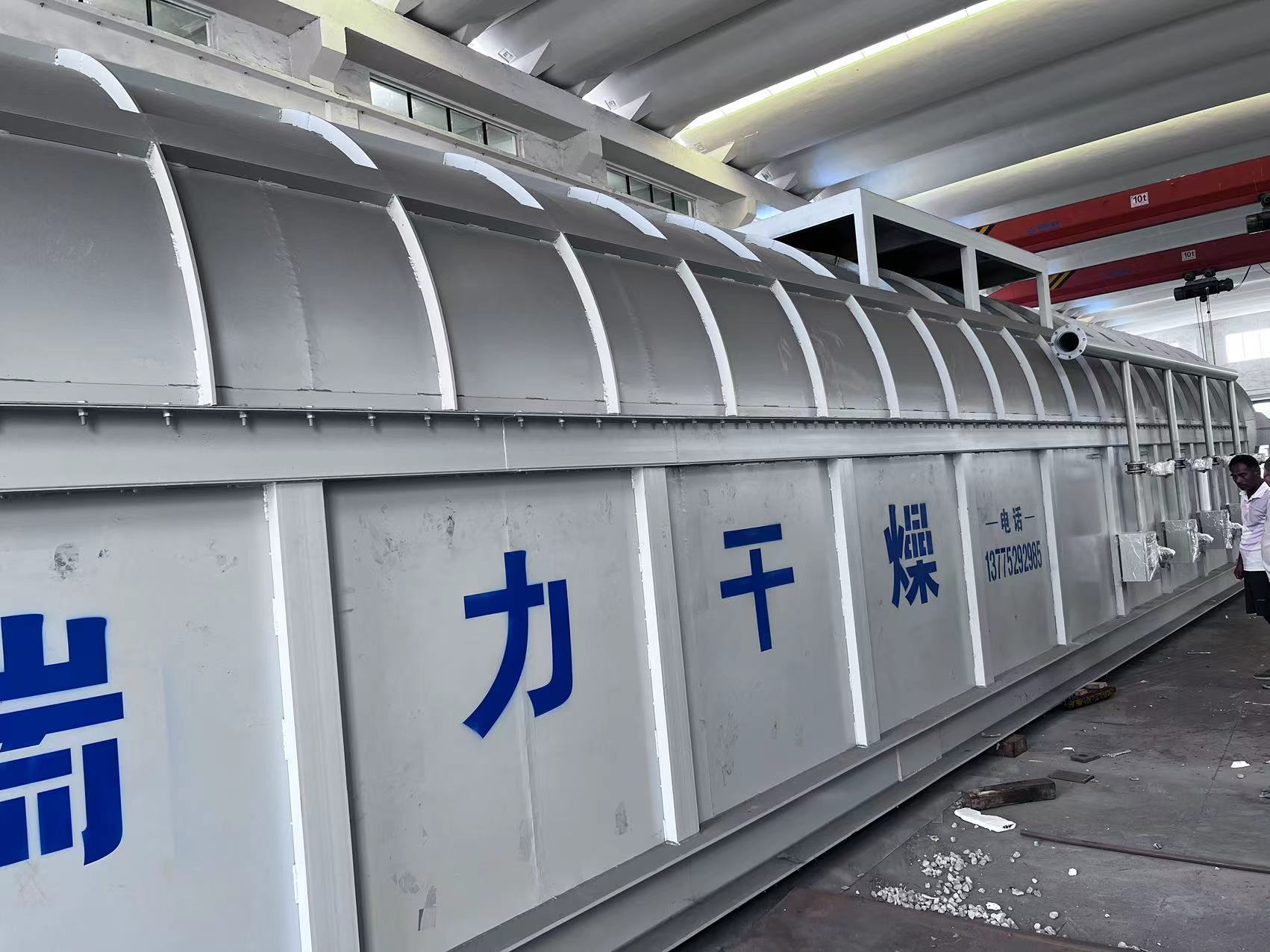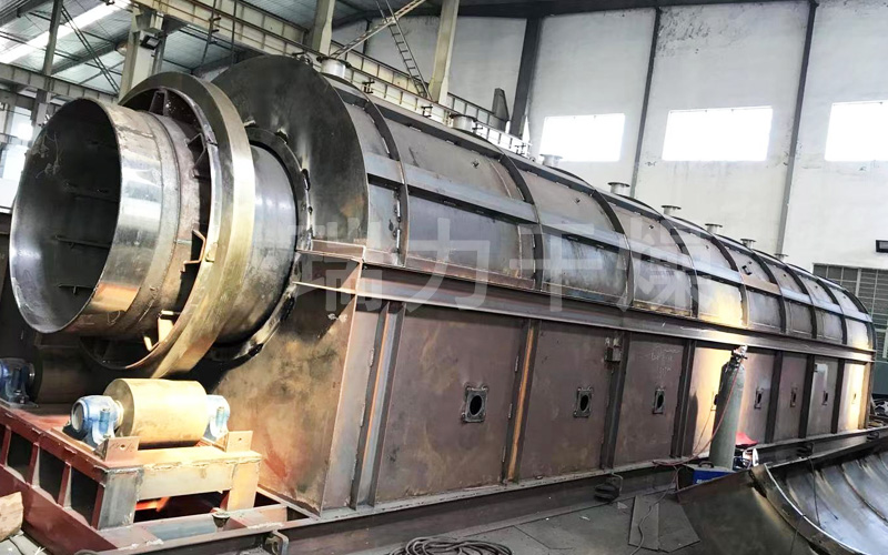 先通過天然氣燃燒器在燃燒室燃燒,將旋轉(zhuǎn)的回轉(zhuǎn)滾筒筒體加熱均勻。物料通過定量加料器將物料送入回轉(zhuǎn)滾筒內(nèi)部,通過筒體的旋轉(zhuǎn)和筒體的傾斜度,使物料不斷地向前移動。在移動的過程中,加熱后的筒體將熱量傳遞給物料,使物料溫度上升,產(chǎn)品得到煅燒,煅燒后的產(chǎn)品成高溫狀態(tài)從尾端排出.高溫間接煅燒窯,它包括主傳動裝置、窯體和與其下部相接的燃燒系統(tǒng),窯體由前至后依次設(shè)有喂料與攪拌機構(gòu)、料斗、回轉(zhuǎn)窯筒體與尾罩;其中,回轉(zhuǎn)窯筒體通設(shè)于所述窯體且延伸出該窯體兩端,回轉(zhuǎn)窯筒體的進(jìn)口端與所述料斗出口端相接,回轉(zhuǎn)窯筒體的出口端與尾罩相接,主傳動裝置設(shè)置于該回轉(zhuǎn)窯筒體的前端或后端。