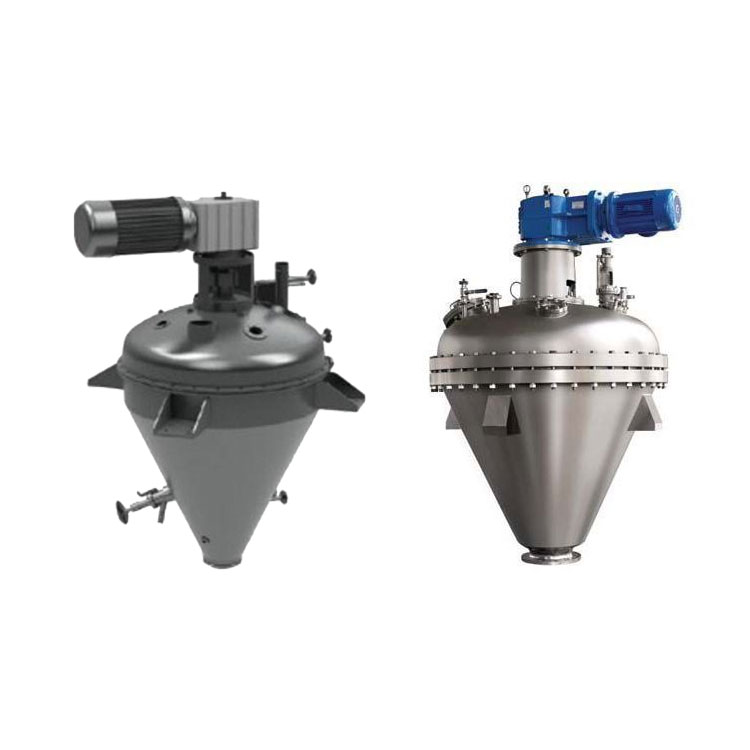 1.單錐真空混合干燥機中的物料在容器內受熱是緊貼容器內壁,由螺旋槳葉自下而上旋轉至容器上部,然后沿主軸呈渦流向下。物料在整個干燥過程中始終在分散運動。物料的運動狀態保證了物料的均衡受熱。