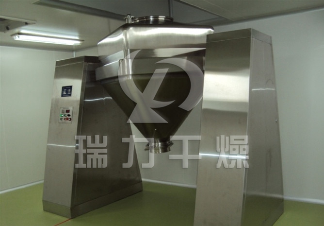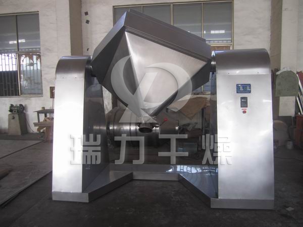 將物料裝入方錐形密閉混合桶內,料斗對稱的軸線與回轉軸軸線成一夾角,不同組分物料在密閉的料斗中進行三維空間運動,產生強烈翻轉和擴散收縮作用,達到好的混合效果。