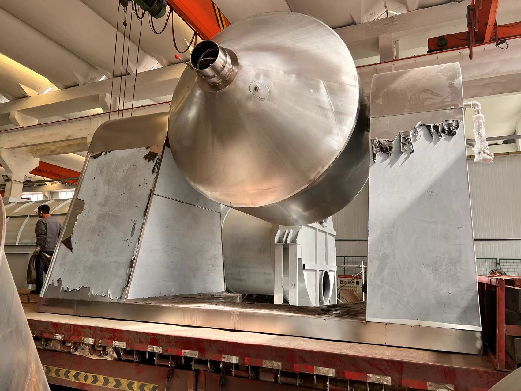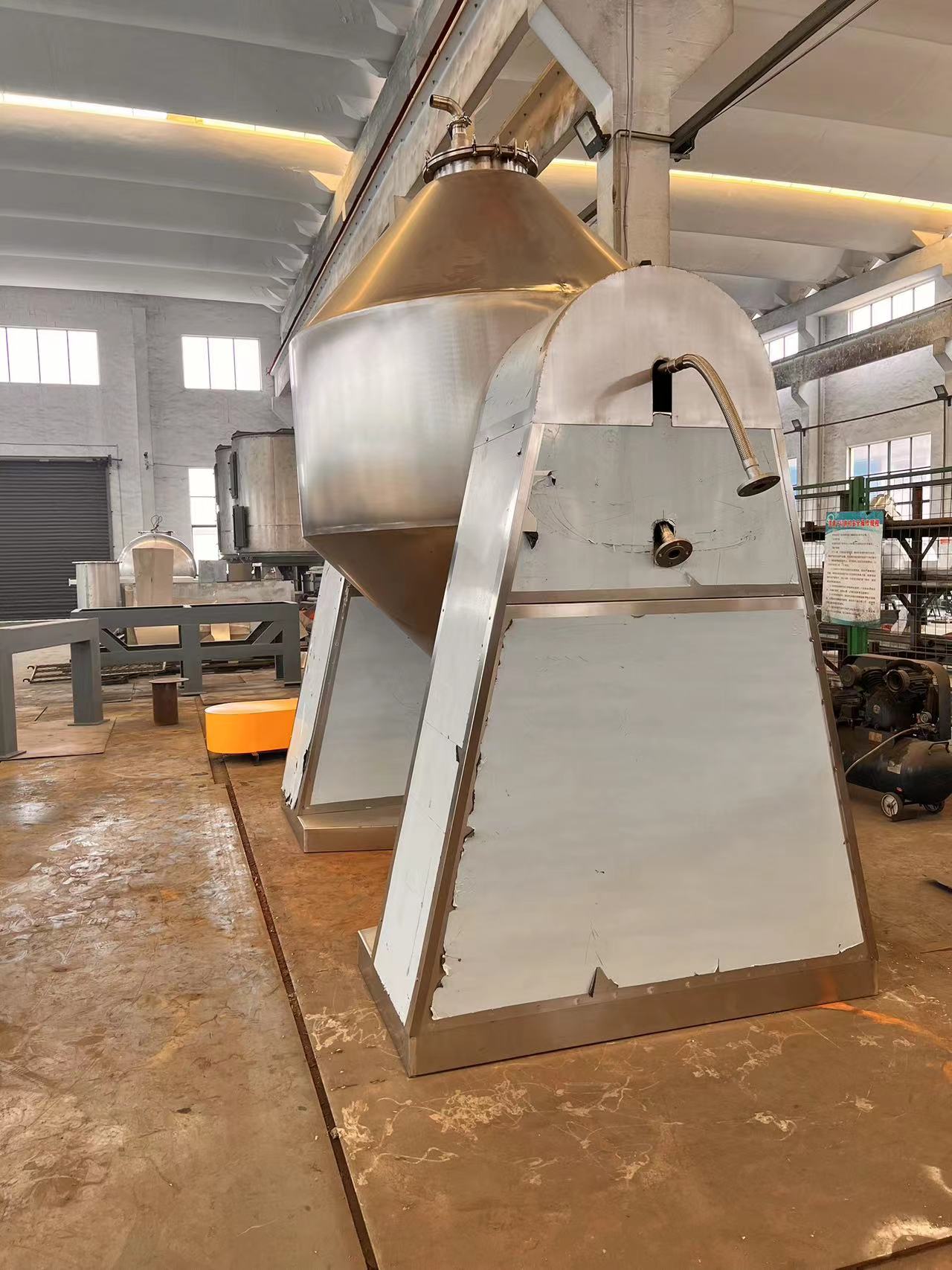 SZG系列雙錐回轉真空干燥機是集混合、干燥于一體的新型干燥機。將冷凝器,真空泵與干燥設備配套,組成真空干燥裝置。(如不需要回收溶劑,冷凝器可不用)本機設計合理,內部結構簡單,清掃容易,物料能全部排出,操作簡便。能降低勞動強度,改善工作環境。同時因容器本身回轉時物料亦轉動,但器壁上不積料,故傳熱系數高,干燥速率大,不僅節約能源,而且物料干燥均勻充分,質量好。可廣泛應用于制藥、化工、食品、染料等行業的干燥。