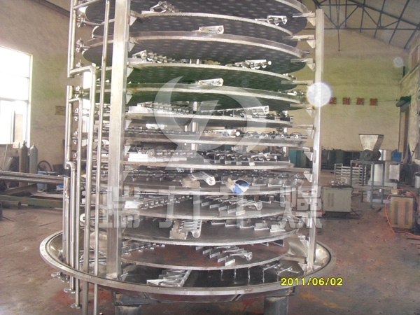 濕物料自加料器連續地加到干燥器上部第一層干燥盤上,帶有耙葉的耙臂作回轉運動使耙臂作回轉運動使耙葉連續地翻抄物料。物料沿指數螺旋線流過干燥盤表面,在小干燥盤上的物料被移送到外緣,并在外緣落到下方的大干燥盤外緣,在大干盤上物料向里移動并從中間落料口落如下一層小干燥盤中。大小干燥盤上下交替排列,物料得以連續地流過整個干燥器。中空的干燥盤內通入加熱介質,加熱介質形式有飽和蒸汽、熱水和導熱油,加熱介質由干燥盤的一端進入,從另一端導出。已干物料從最后一層干燥盤落到殼體的底層,最后被耙葉移送到出料口排出。濕份從物料中逸出,由設在頂蓋上的排濕口排出,真空型盤式干燥器的濕氣由設在頂蓋上的真空泵口排出。從底層排出的干物料可直接包裝。通過配加翅片加熱器、溶劑回收冷凝器、袋式除塵器、干料返混機構、引風機等輔機,可提高其干燥的生產能力,干燥膏糊狀和熱敏性物 料,可方便地回收溶劑,并能進行熱解和反應操作。