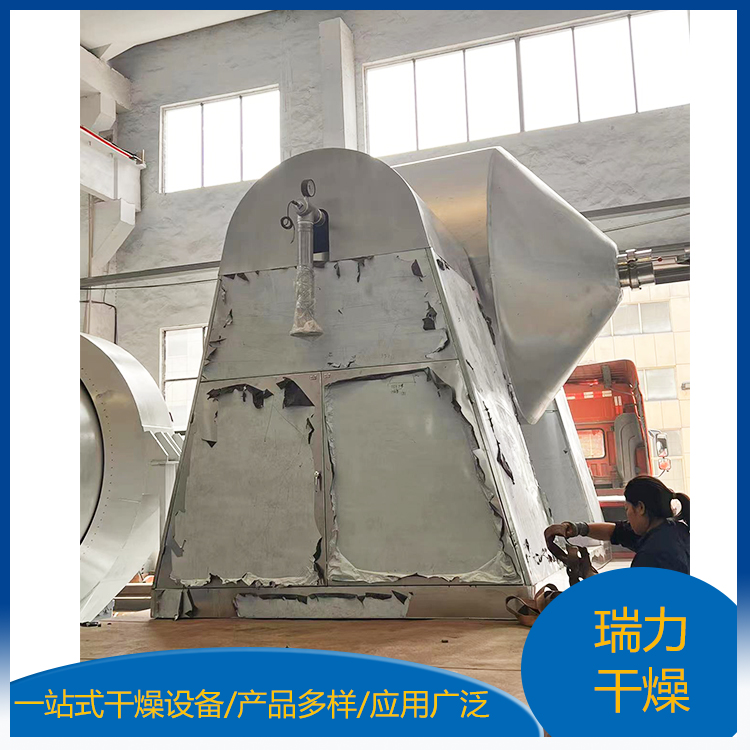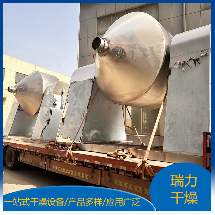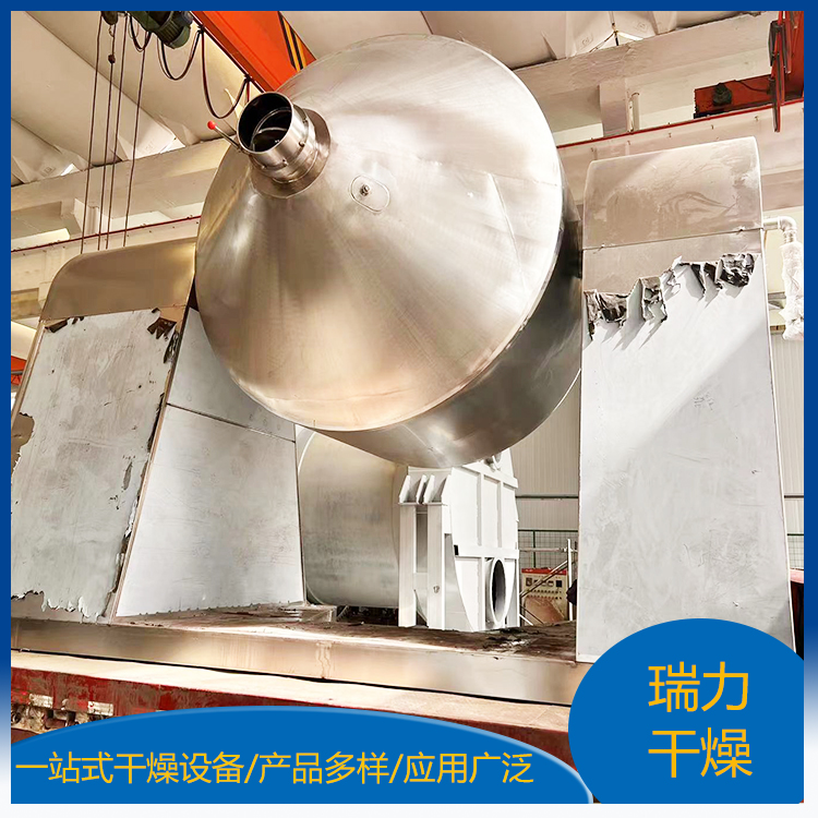 雙錐回轉真空干燥機為雙錐形的回轉罐體,罐內在真空狀態下,向夾套內通入蒸汽或熱水進行加熱,熱量通過罐體內壁與濕物料接觸,濕物料吸熱后蒸發的水汽,通過真空泵經真空排氣管被抽走。由于罐體內處于真空狀態,且罐體的回轉使物料不斷的上下內外翻動,故加快了物料的干燥速度,提高干燥效率,達到均勻干燥的目的。雙錐回轉真空干燥機系統主要由雙錐回轉真空干燥機、冷凝器、除塵器、真空抽氣系統、加熱系統、冷卻系統、電控系統等組成。